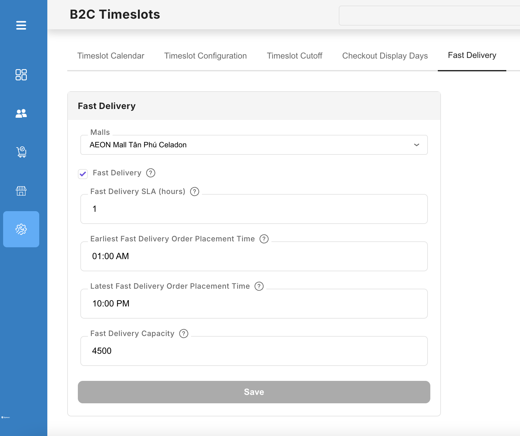 On this page, Admins can enable or disable Fast Delivery for each mall. Fast Delivery can be configured separately for B2B and B2C users.
