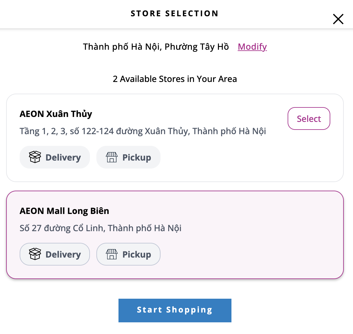 - If location entered is serviced by multiple malls, the Select Store modal will appear: