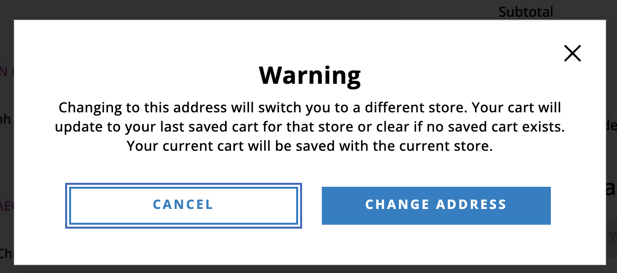 - If an address change updates the store the user is shopping, their cart will update entirely to the new store. If this happens at checkout, the user will ned to agree to the warning before seeing their cart update.